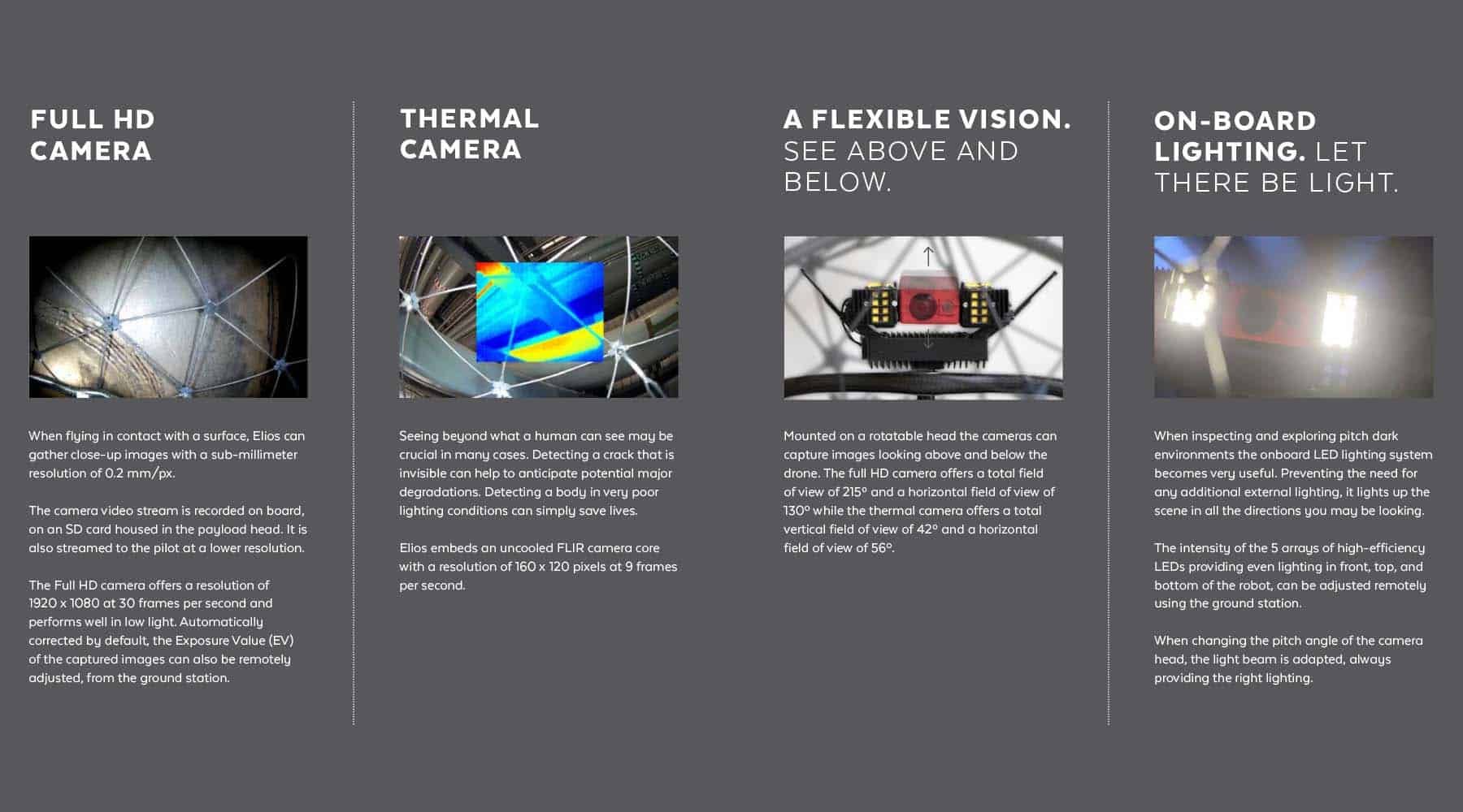 To add to the specialised cameras that have been developed, H&B also operate a Swiss inspection drone which allows for immediate and fast inspection of most confined and inaccessible spaces above 400mm in size.