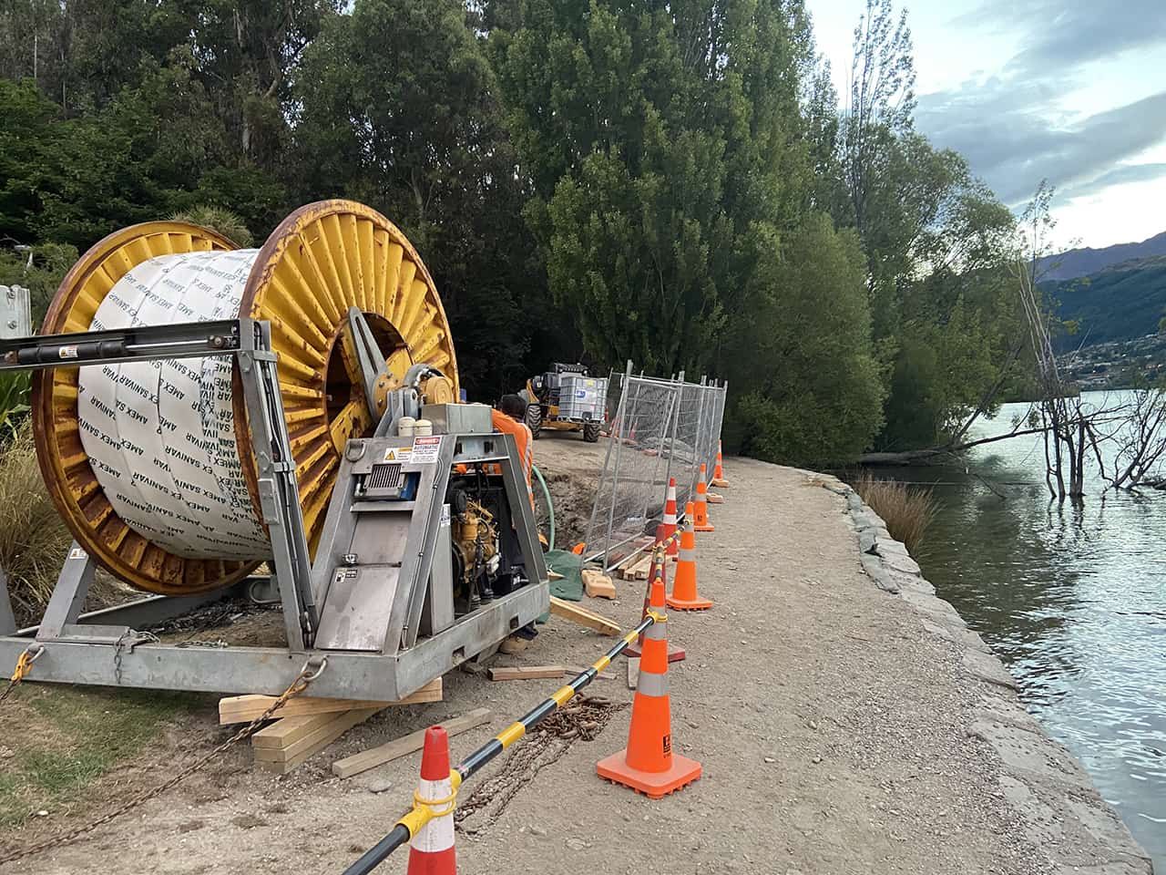 Queenstown Lakes District Council (QLDC) needed to upsize the pumping station which serviced Kelvin Heights. Unfortunately, the existing 400mm PN6 & PN8 PE pipework could not handle the increased pump pressure so needed to be upgraded. The 700m pipeline ran in a small corridor approx. 5m off the shore line of Lake Wakatipu and along the frontage of the Hilton Hotel. The retaining wall holding up the walk way on the lake edge was also collapsing which meant heavy vehicles and plant could not access the pipeline. H&B’s solution was to line the existing PE pipeline with Amex pressure liner to increase the rating to PN16.