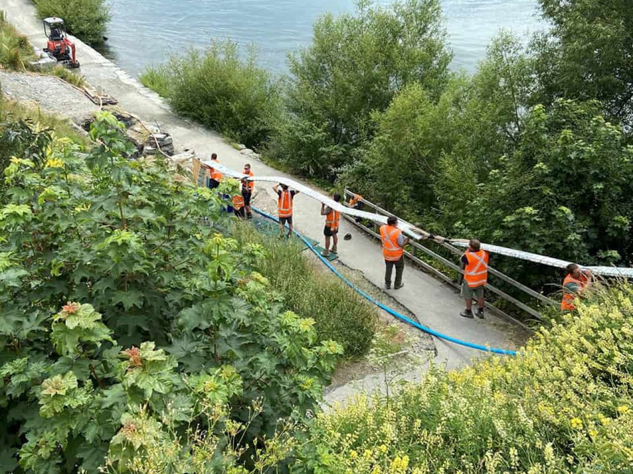 The installation which took one week was extremely challenging due to a number of factors. The existing pipeline was very poorly laid with grade changes and dips of up to 15% with no air valves or scouring points for maintenance. It had not been cleaned in over a decade and the level of contamination we had to remove from the line was extreme. The pipeline was quarter to half full of fat, shingle, rocks and debris for its entirety. This was cleared using a combination of pigging, jetting and robotics. The installation was carried out from either end with minimal disruption to the Hilton Hotel and surrounding residents. The retaining wall to the lake edge was kept intact, the walking track remained open to the public throughout the works and there were no H&S or environmental issues.